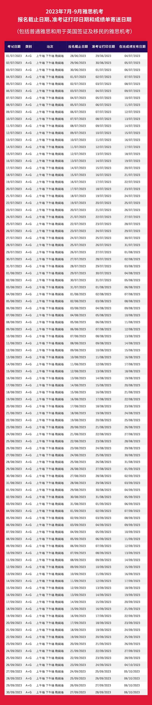 2023年7月-9月普通雅思和用于英國簽證及移民的雅思機考報名截止日期、準考證打印日期和成績單寄送日期:
